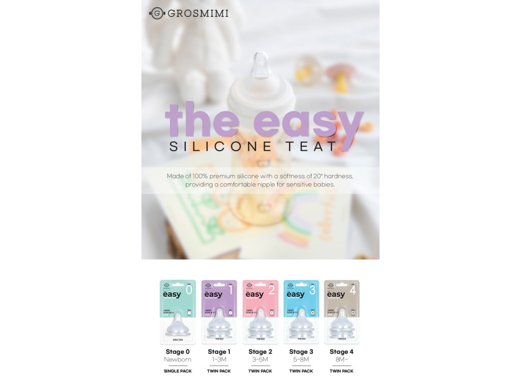Náhradní silikonové dudlíky GROSMIMI The Easy Nipple z platinového silikónu medical-grade. Anti-colic design snižuje koliky a podporuje přirozené kojení. Dostupné ve 5 stupních podle věku dítěte.