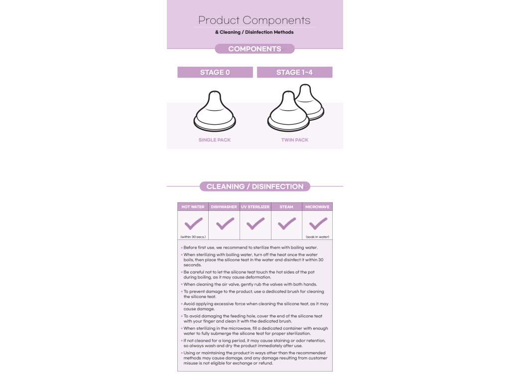 Čištění a údržba: Umyjte dudlík důkladně před prvním použitím. Vyčistěte a vysušte ihned po použití, aby se předešlo skvrnám a zápachům. Použijte speciční kartáček na dudlíky pro důkladné vyčištění uvnitř. Dudlík je vhodný do myčky nádobí (horní police). Možnost sterilizace vroucí vodou (30 sekund) nebo v parním sterilizátoru. Kvůli povaze silikonového materiálu může mít dudlík po umytí specifický zápach - doporučujeme vzdušné sušení alespoň 24 hodin. Při delším nepoužívání se ujistěte, že je dudlík úplně suchý před uložením. Nevystavujte dlouhodobě přímému slunečnímu záření. Nepoužívejte abrazivní čisticí prostředky.