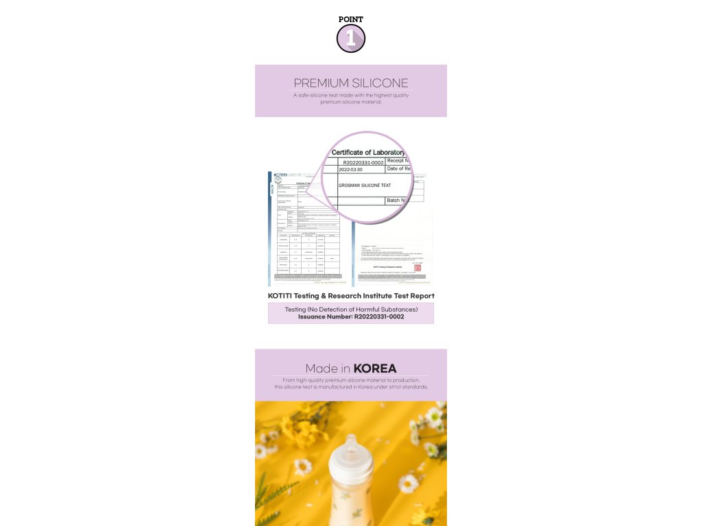 Obsah balení: Stage 0 - 1 kus, Stage 1-4 - 2 kusy. Materiál: Platinový silikon medical-grade. Tepelná odolnost: Do 180°C. Anti-colic systém: Ano, dvojitý vzduchový ventil. Dostupné stupně: Stage 0, Stage 1, Stage 2, Stage 3, Stage 4. Kompatibilita: GROSMIMI PPSU Feeding Bottle, vybrané širokohrdlé lahve. Průměr hrdla: 4,7 cm (široké hrdlo). Země původu: Korea. Údržba: Vhodné do myčky, možnost sterilizace vroucí vodou a parním sterilizátorem. Doporučená výměna: Každé 2-3 měsíce. Certifikace: Medical-grade silikon, BPA-free.