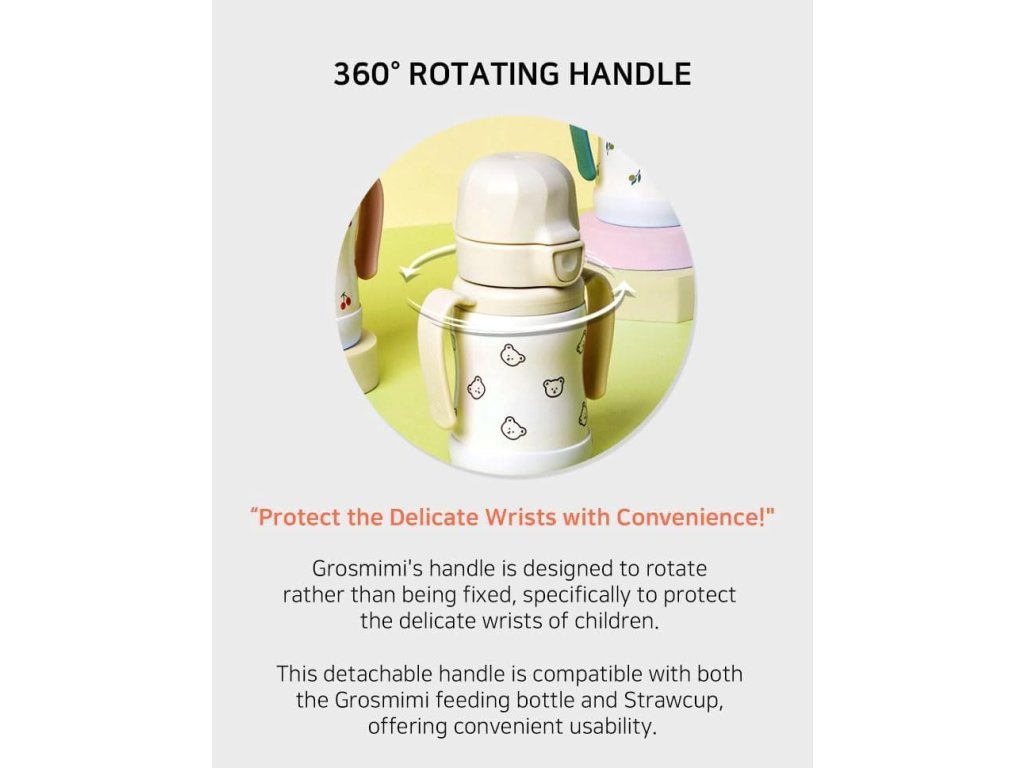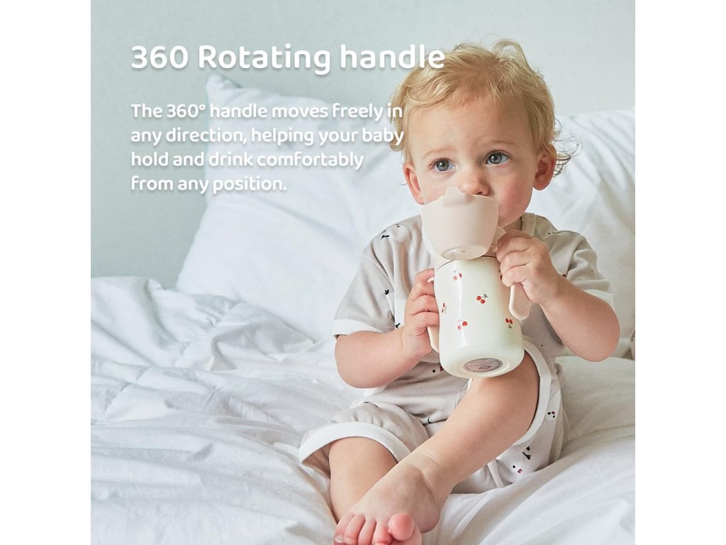 Hrnek je vybaven ergonomickými rukojeťmi, které se otáčejí o 360°, což umožňuje dítěti pohodlně držet hrnek z jakéhokoliv úhlu. Rukojeti jsou navrženy pro malé dětské ručičky a podporují samostatnost při pití. Rotační mechanismus snižuje zátěž zápěstí a umožňuje přirozené držení.