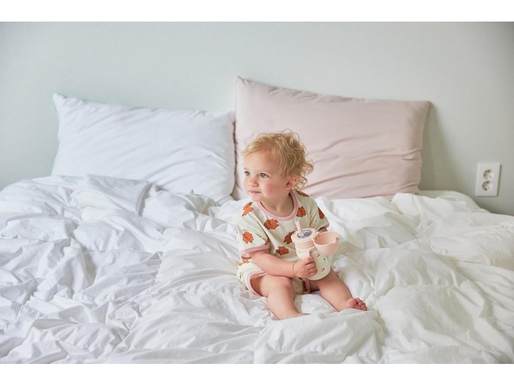 Hrnek je vybaven ergonomickými rukojeťmi, které se otáčejí o 360°, což umožňuje dítěti pohodlně držet hrnek z jakéhokoliv úhlu. Rukojeti jsou navrženy pro malé dětské ručičky a podporují samostatnost při pití. Rotační mechanismus snižuje zátěž zápěstí a umožňuje přirozené držení.