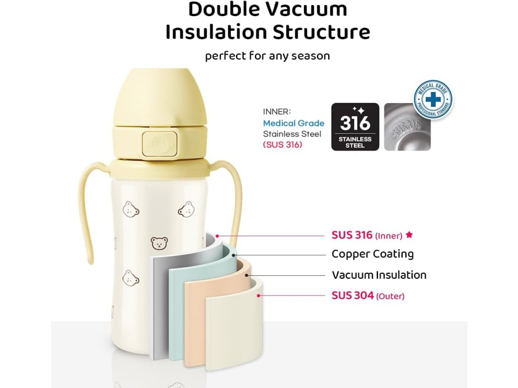 Vnitřní vrstva - 316 Medical-Grade Stainless Steel (SUS 316): Nejvyšší kvalita nerezu používaná ve zdravotnictví a chirurgických nástrojích. Ocel 316 obsahuje molybden, který ji činí odolnější proti korozi než běžná nerezová ocel 304. Je chemicky neutrální, neuvolňuje kovy ani při kontaktu s kyselými nápoji (džusy, ovocné čaje) a je bezpečná i pro citlivé děti.