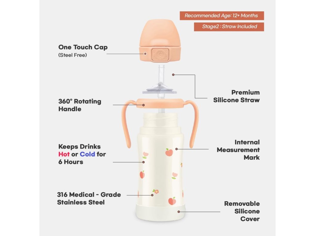 Flaška obsahuje odolnější slamku Stage 2 z platinového silikónu medical-grade speciálně navrženou pro děti od 12 měsíců, které již mají prořezávající se zoubky. Stage 2 slamka je silnější a odolnější vůči kousání než Stage 1, ale stále jemná k dětským dásním. Zachovává si tvar i při intenzivním používání a neobsahuje žádné chemické katalyzátory.